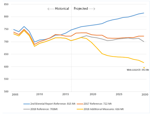 Figure 2: Historical greenhouse gas emissions and projections, Canada, 2005 to 2030 (Megatonnes of carbon dioxide equivalent)