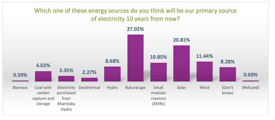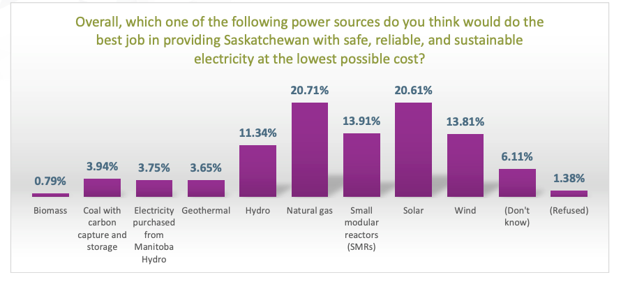 When participants were asked to choose one power source that would do the best job in providing Saskatchewan with safe, reliable, and sustainable electricity at the lowest possible cost, the choices from highest to lowest support were: natural gas, solar, small modular reactors, wind, hydro, coal with carbon capture and storage, Manitoba Hydro imports, geothermal, and biomass. A relatively small number of respondents either refused to answer the question or had no opinion.