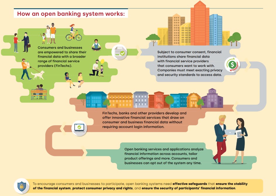 The Open Banking consultation is different from most Department of Financial banking sector consultations. The 2019 consultation paper uses cartoon figures to explain the idea (see Figure 1). The Senate Banking report asks “What Open Banking Means for You,” addressing the consumer directly rather than using the agent-less passive voice typical of these reports.