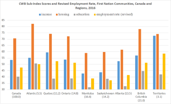 Figure 1: CWB Sub-Index Scores and Revised Employment Rate, First Nation Communities, Canada and Regions, 2016