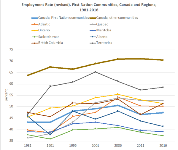 Figure 2: Employment Rate (revised), First Nation Communities, Canada and Regions, 1981-2016