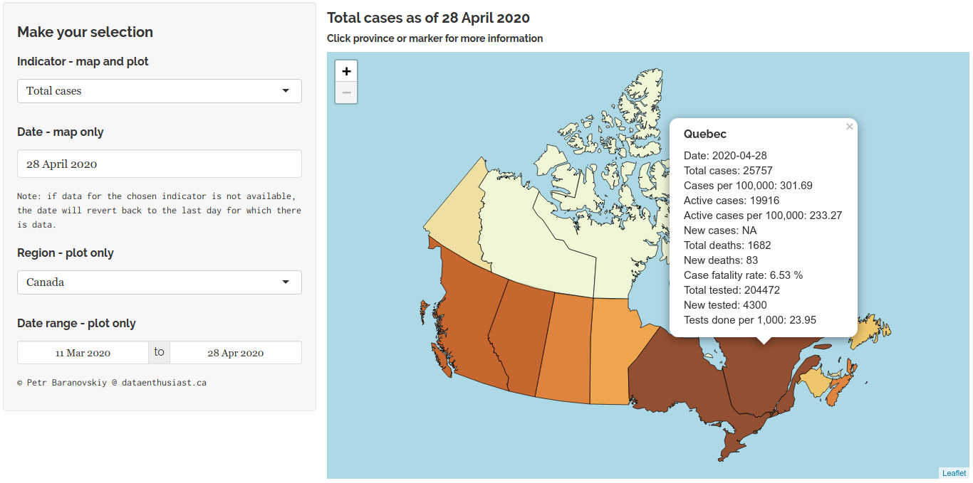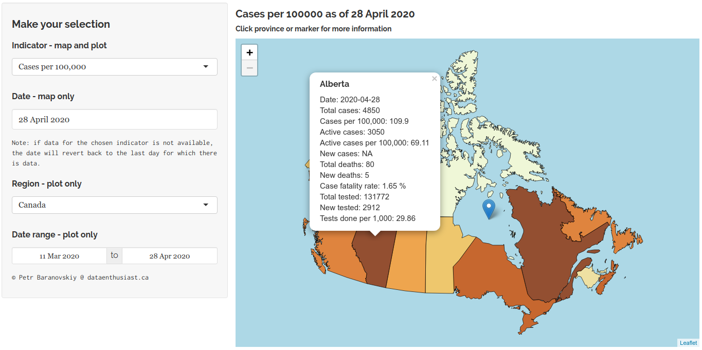 Now you can see that when adjusted for the population size, on April 28, 2020 the two most affected provinces were Quebec (which still was the first) and Alberta. And if you are wondering about what exactly “Total cases” means, you can click the “About” tab at the top of the webpage and find out that the “Total cases” means all cases since the start of the epidemic, i.e. cumulative cases. Note that the map’s title will conveniently refer to the indicator and the date you’ve selected.