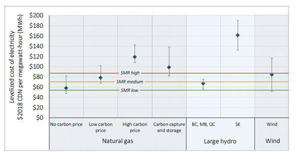 - The estimated levelized cost per MWH of electricity generated by SMRs is probably similar to that for natural gas or hydro. There are many SMR designs on the drawing board, and no consensus on optimal design. Hence, there is considerable uncertainty about the range of unit costs of energy generated by SMRs. By commitment to build multiple SMRs in Canada, we can contribute to developing optimum designs (see Figure 1).