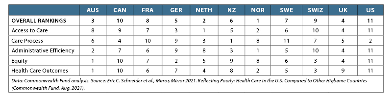 Table 1 summarizes the 11 country rankings across the five evaluation categories used by the Commonwealth Fund. The full report contains a wealth of detail underlying the rankings in each category.