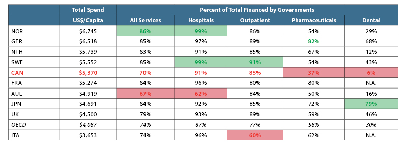 Government coverage of health services: It may come as a surprise to many Canadians that among highly developed countries, except for the US, the fraction of health care that is publicly funded in Canada is relatively low at 70%. Western European countries are typically in the range of 85%—see “All Services” column in Table 2, drawn from OECD data, where the rows are ordered by decreasing per capita spending on public and private health care combined. (The highest percentages in each column are coloured green, and the lowest are in red.) Among the 10 peer countries illustrated, Canada ranks last in public coverage of both pharmaceutical expense (37%) and dental expense (6%). This is to be compared for example with Germany where the public coverage of these costs is 82% and 68% respectively. On the other hand, governments in Germany spend almost 50% more per capita than governments in Canada to cover all health care expenses. But remarkably, governments in Australia spend 12% less per capita than in Canada yet provide greater coverage of drugs and dental care while, according to the Commonwealth Fund assessment, delivering more effective health care overall.