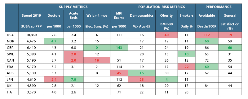 There are noteworthy cross-country variations among the “supply” and “risk” factors in the table—e.g., Japan and Germany have far more hospital beds per capita than other peer countries. Japan, US, UK and Canada have relatively few doctors per capita. Very few Germans, French and Americans wait more than 4 months for elective surgery, whereas almost 20% of Canadians do. Japan’s population is old and has a relatively high percentage of smokers, but per capita health spending is among the lowest, perhaps helped by a very low incidence of obesity. But the UK and Australia have comparatively high obesity rates, yet relatively low health spending.